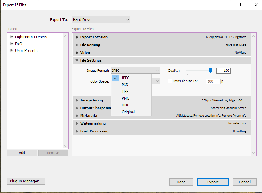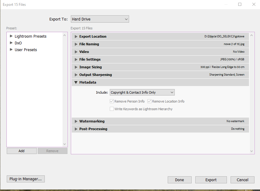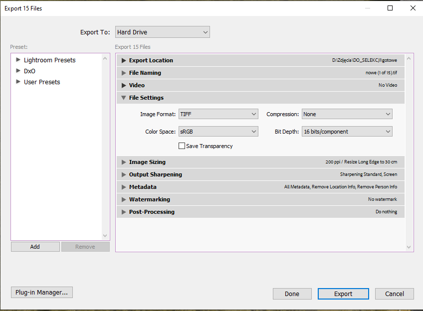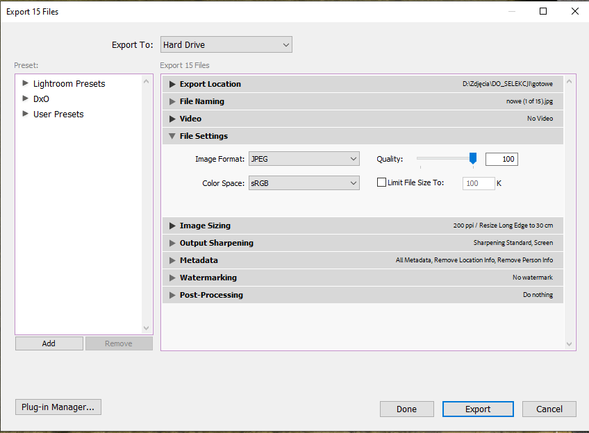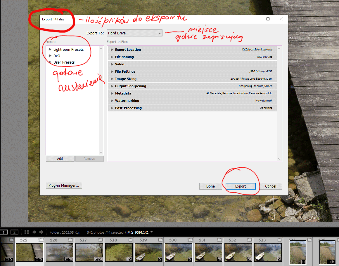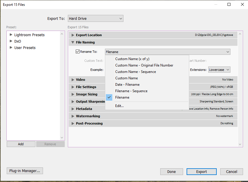 Export plików w lightroom Classic