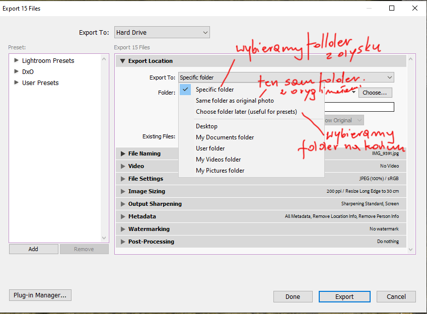 Same folder as original photo – zapiszemy wyeksportowane pliki w katalogu z oryginalnymi plikami RAW. Warto tutaj zaznaczyć opcje Put in Subfolder i wpisać nazwę podfolderu ( u mnie Gotowe) aby oddzielić RAW od gotowych jpg.