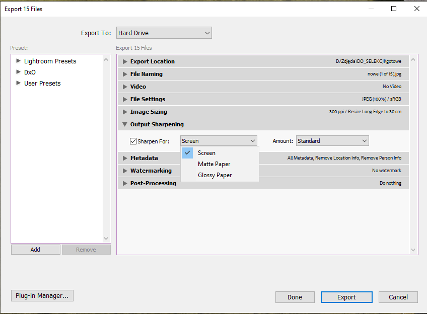 W czasie eksportu Lightroom Classic daje Ci kilka możliwości wyostrzenia obrazu. Dla monitora pierwsza opcja i później papier matowy i na końcu błyszczący. Do tego możemy wybrać Amount czyli ilość niską, standardową i wysoką.