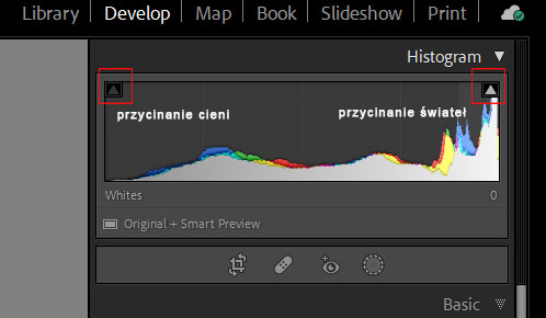 Jeśli na skraju histogramu znajdują się szczyty wykresu oznacza to, że w tych miejscach są przycięte  biele (szczyty po prawej stronie) lub czernie (szczyty po lewej stronie). Są to miejsca pozbawione informacji skrajnie prześwietlone lub niedoświetlone. Jeśli chcesz te miejsca zobaczyć na zdjęciu kliknij trójkąty w lewym lub prawym rogu albo jeszcze prościej użyj skrótu J. Powierzchnie prześwietlone zostaną zamaskowane na czerwono a skrajnie niedoświetlone na niebiesko.