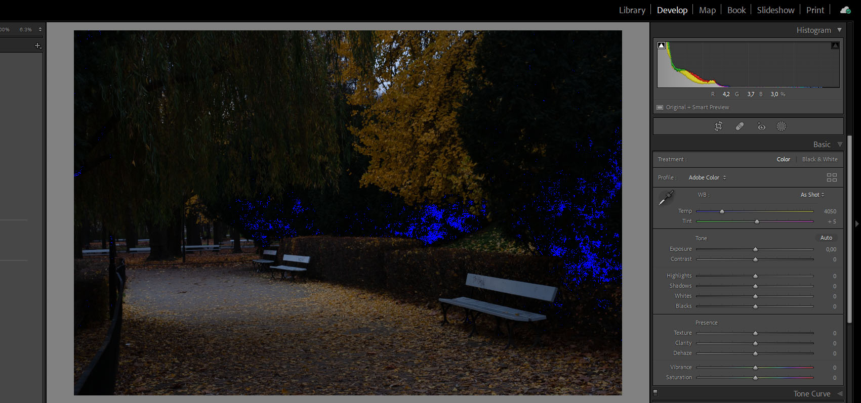 Informacje o przycinaniu ułatwią ustalenie poprawnej ekspozycji w tych miejscach. Wystarczy użyć odpowiednich suwaków. I tak np. aby wydobyć szczegóły w przyciętych światłach używamy suwaka Whites i Highlights. Przesuwając je w lewą stronę zobaczycie, że czerwona maska znika a są przywracane szczegóły. Podobnie będzie z niedoświetleniem tylko w tym przypadku użyjemy Shadows i Blacks.