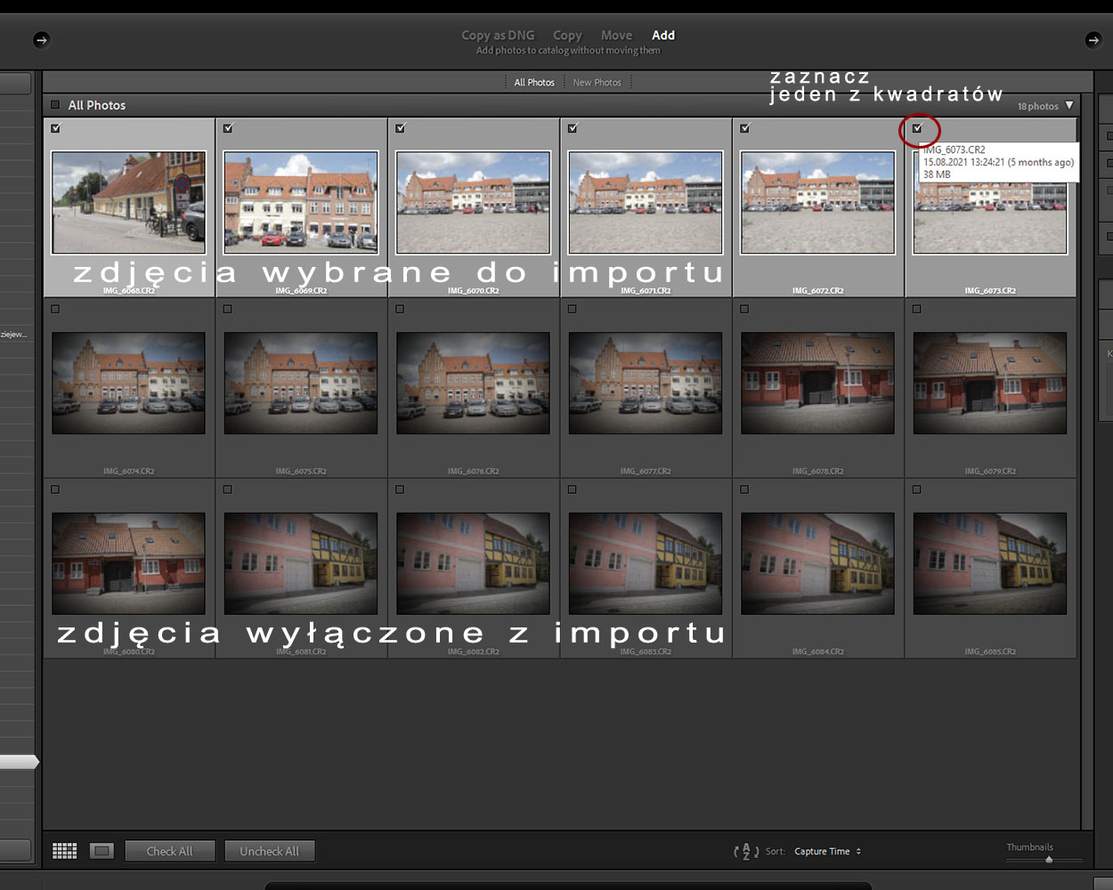 Widzimy w nim ikony naszych fotografii, które chcemy pobrać do katalogu Lightroom. Program automatycznie zaznacz wszystkie pliki do pobrania, ale użytkownik może dokonać wyboru indywidualnego. W tym celu wystarczy operować znacznikiem umieszczonym w kwadracie w górnej części okna miniatury pliku. Jeśli jakiegoś zdjęcia nie chcemy zaimportować do programu wystarczy usunąć znacznik.