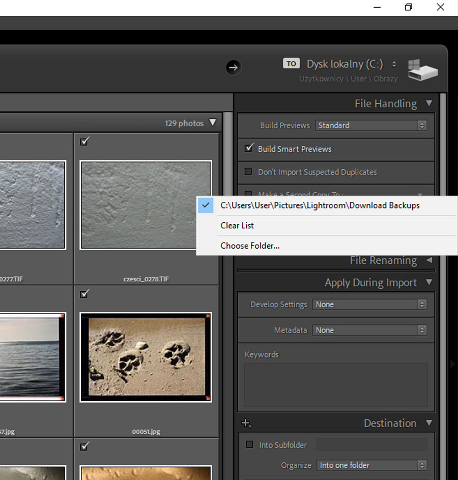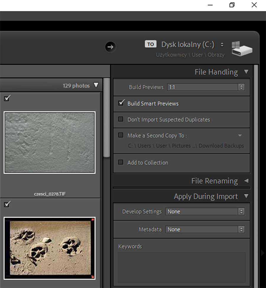 Moim zdaniem lepszym rozwiązaniem będzie wybranie drugiego wariantu czyli Copy. Przy takim ustawieniu skopiujemy oryginalne pliki np. RAW do wskazanego lub na bieżąco utworzonego folderu. Folder ten będzie jednocześnie będzie katalogiem lightroom.