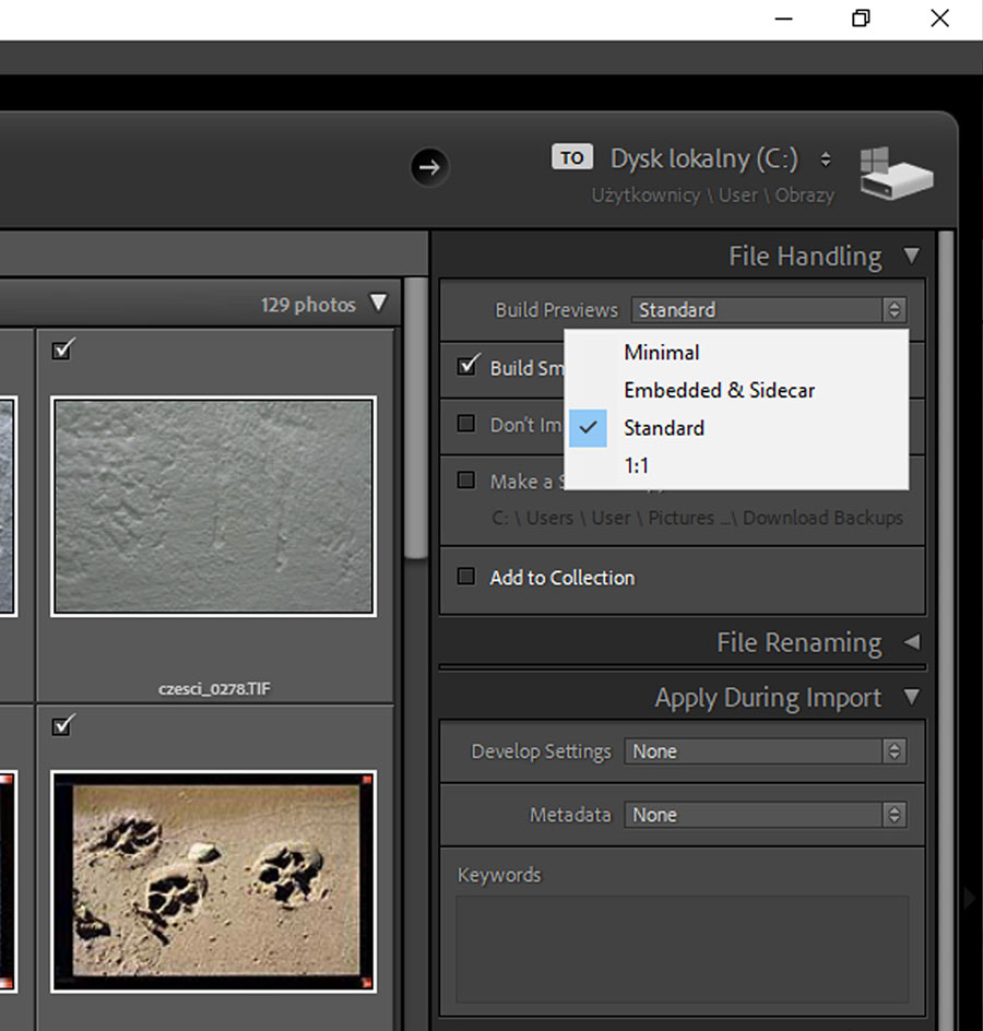 Obsługa plików zaczyna się od wyboru w jaki sposób będzie tworzony podgląd zaimportowanych fotografii – Build Previews. Rozwijamy listę i widzimy cztery opcje. Na samej górze Minimal czyli podgląd o najniższej jakości ale za to nie obciążający programu. na końcu listy widzimy 1:1 ten pogląd na pewno obciąży nam Lightroom ale zdecydowanie łatwiej będzie pracować nad szczegółami (ostość i szumy).