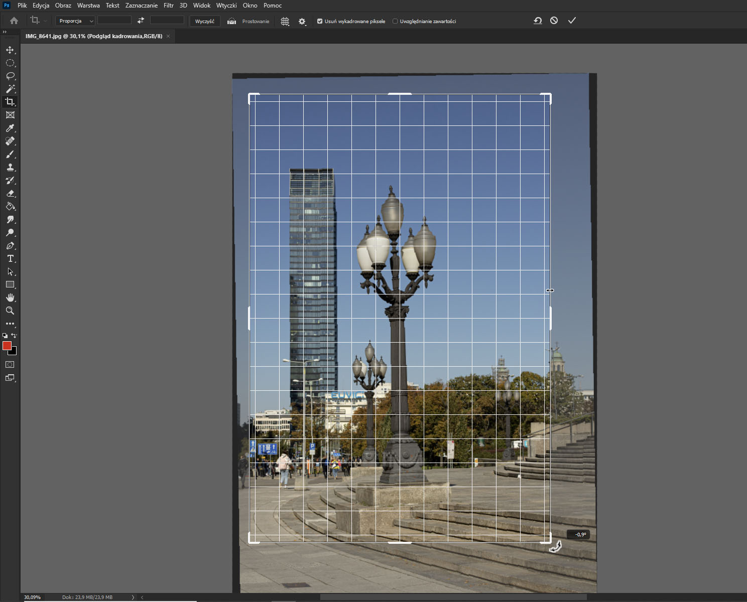 Kolejna funkcja na pasku opcji narzędzia do kadrowania to Prostowanie z ikoną poziomnicy. Używamy przez przeciągnięcie wzdłuż linii horyzontu czy wzdłuż pionowych linii budynków, latarni i w ten sposób prostujemy kadr.
