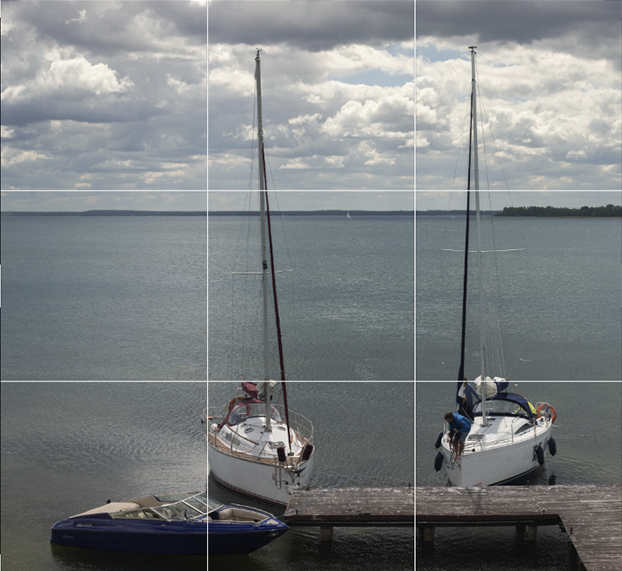 Dalej widzimy ikonę siatki, po której rozwinięciu użytkownik może wybrać nakładkę ułatwiającą przygotowanie kadru o prawidłowej kompozycji obrazu. Na poniższym przykładzie mamy wybraną siatkę dzięki niej łatwiej wyprostować linie budynków, horyzontu. Pierwsza pozycja to Złoty podział, dalej wspomniana Siatka, Przekątna, Trójkąt, Złota Proporcja i Złota spirala.