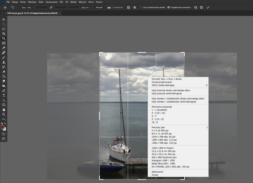 Pod prawym przyciskiem myszy mamy długa listę z opcjami usprawniającymi kadrowanie w zdjęcia warto się jej przyjrzeć i korzystać w czasie pracy.